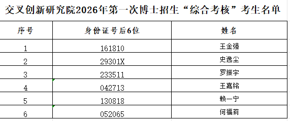 交叉创新研究院2026年第一次博士招生“综合考核”考生名单